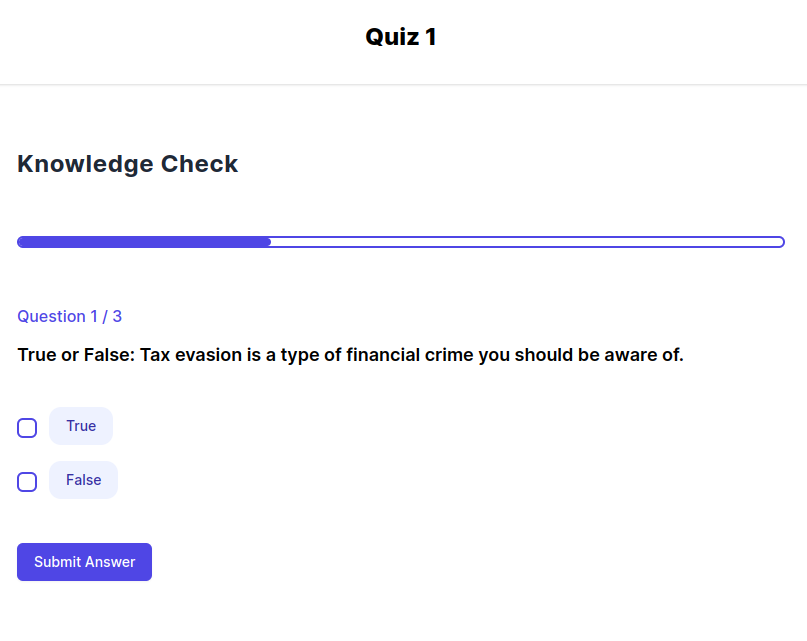 Our Anti-Money Laundering e-learning course is delivered online through our Tayl platform. This means you can complete this course on any device that can access the internet, and you can take a break at any time and save your progress. You can also add more users to your account, access more compliance training courses, and track who has done what.