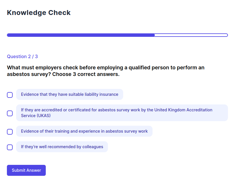 Our Asbestos Awareness e-learning course is delivered online through our Tayl system. This means you can complete this course on any device that can access the internet, and you can take a break at any time and save your progress. You can also add more users to your account, access more compliance training courses, and track who has done what.