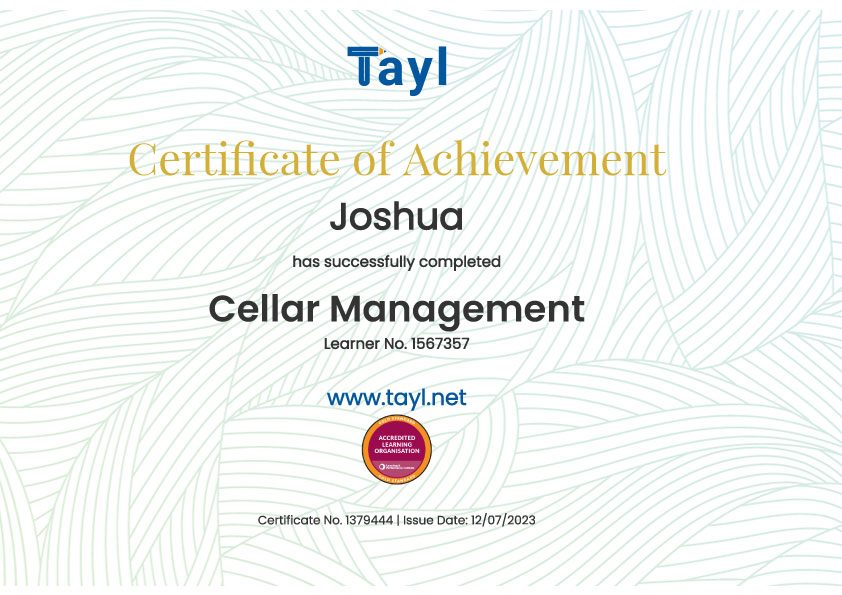To complete your course and download your Cellar Management certificate, you need to have correctly answered enough questions in the quizzes throughout the course. You’re able to retake these quizzes as many times as you want. The certificate is printable and will be accessible at any time when you log into our platform. The certificate is saved on our system so you can use it to prove a commitment to ongoing legal compliance.