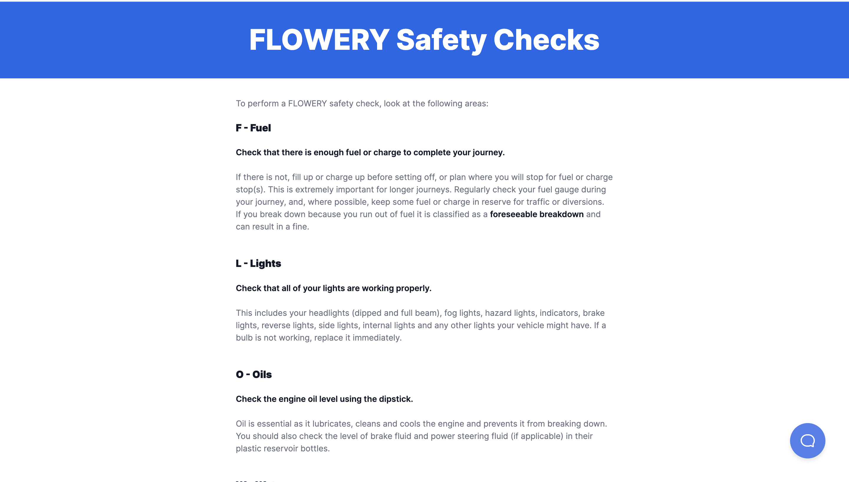 | Safe Vehicle | Importance of Vehicle Safety Checks, FLOWERY Safety Checks; Additional Vehicle Checks; Seatbelt and Seat Position; Mirrors; Safe; Loading and Towing; MOTs and Insurance; Vehicle Emergency Kits. |