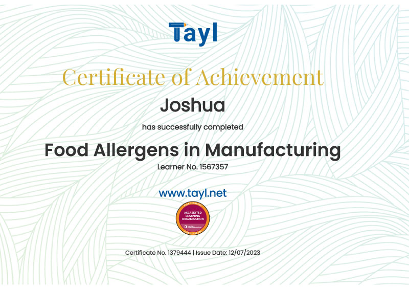 To complete your course and download your Food Allergens in Manufacturing certificate, you need to have correctly answered enough questions in the quizzes throughout the course. You’re able to retake these quizzes as many times as you want. The certificate is printable and will be accessible at any time when you log into our platform. The certificate is saved on our system so you can use it to prove a commitment to ongoing legal compliance.