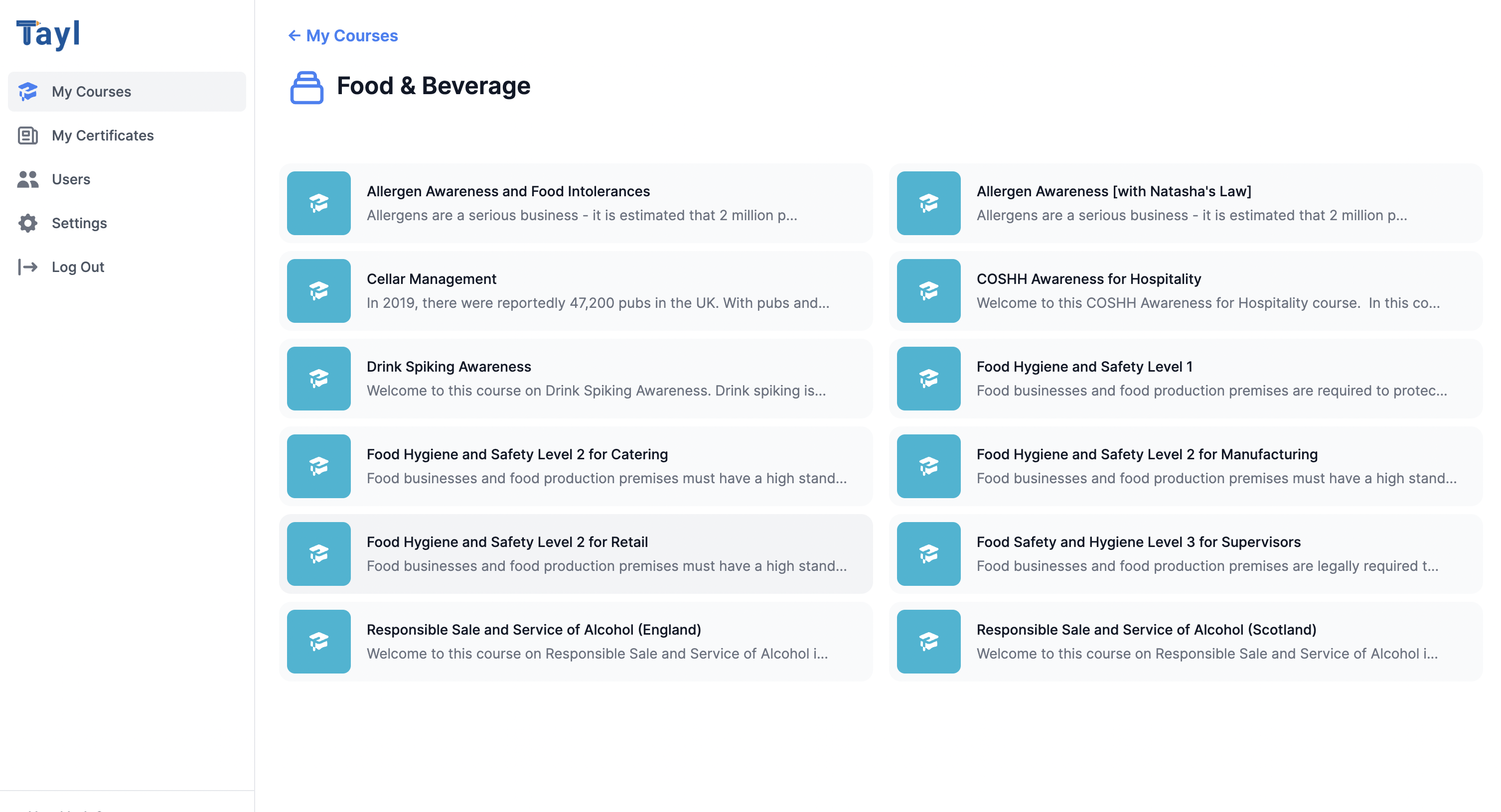 Our Level 2 Food Hygiene & Safety e-learning course is delivered online through our Tayl platform. This means you can complete this course on any device that can access the internet, and you can take a break at any time and save your progress. You can also add more users to your account, access more compliance training courses, and track who has done what.