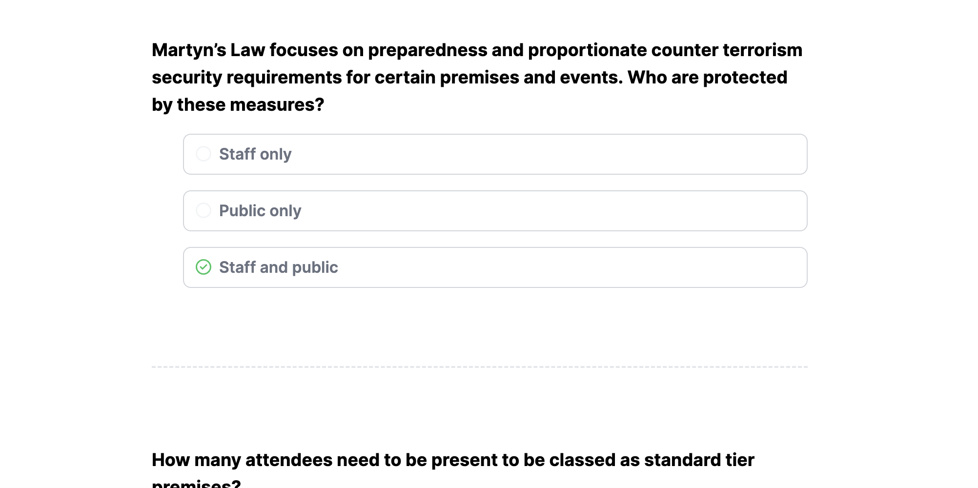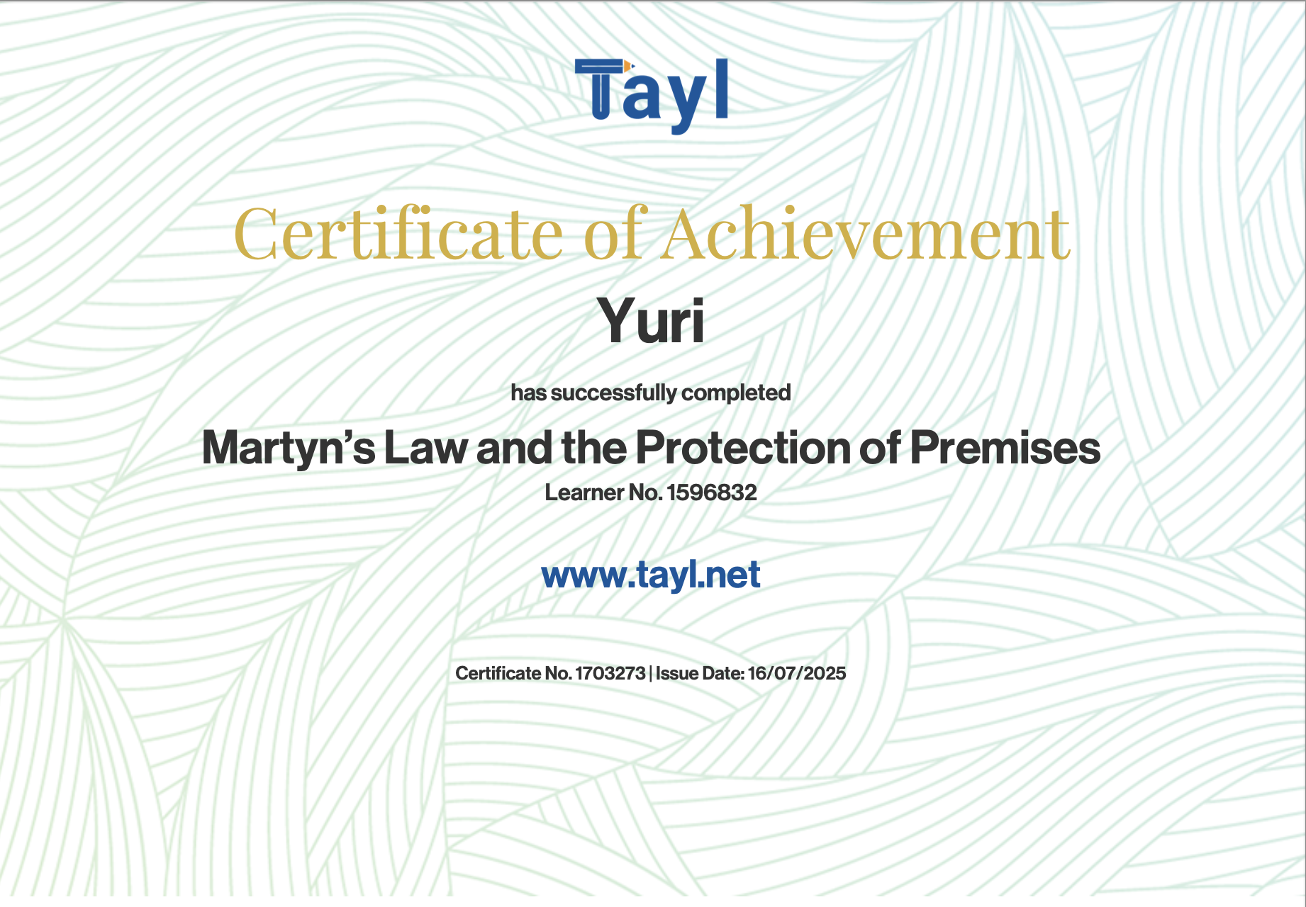 Our Martyn’s Law and the Protection of Premises course e-learning course is delivered online through our Tayl platform. This means you can complete this course on any device that can access the internet, and you can take a break at any time and save your progress. You can also add more users to your account, access more compliance training courses, and track who has done what.