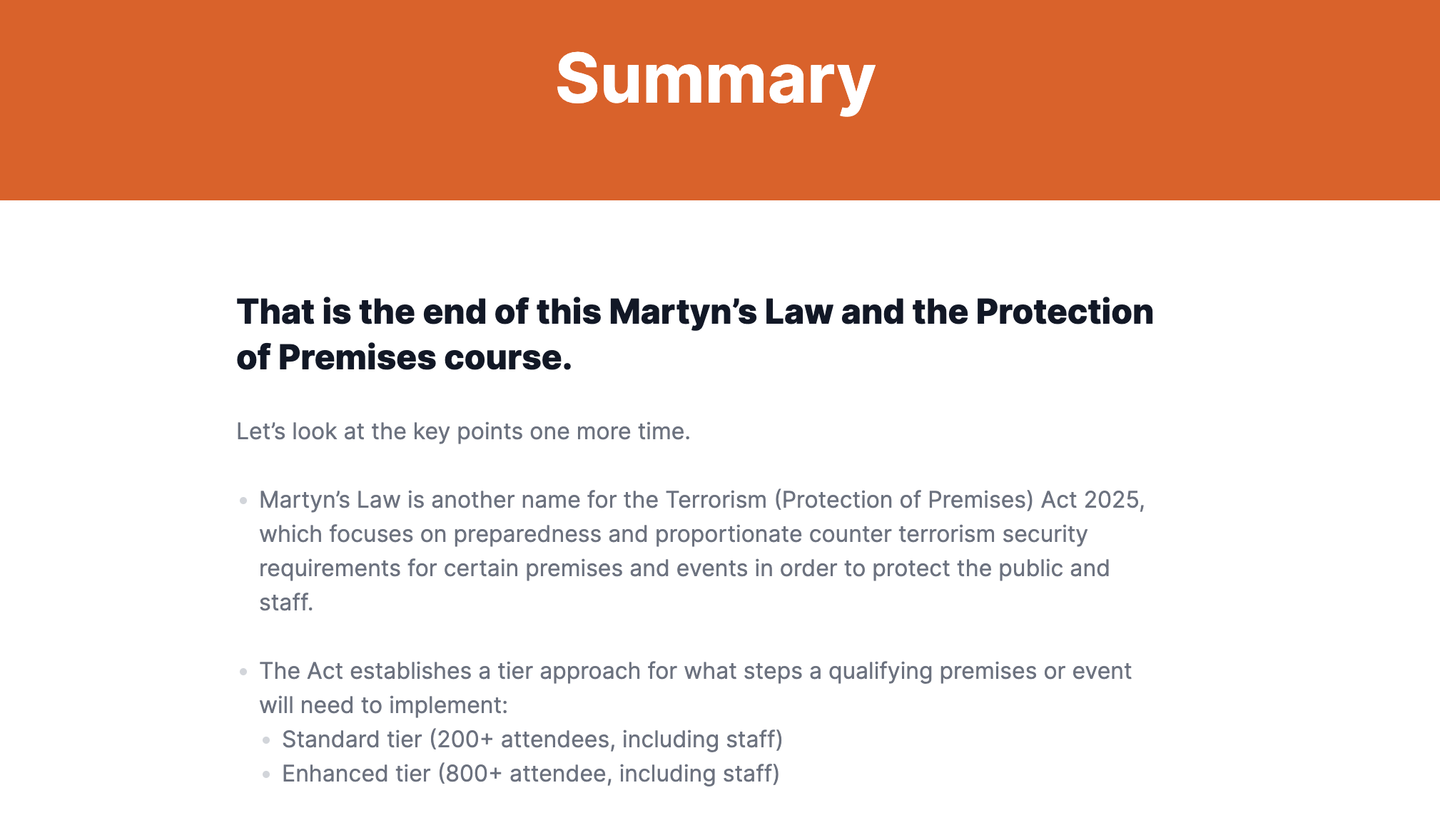 To complete your course and download your Martyn’s Law and the Protection of Premises course certificate, you need to have correctly answered enough questions in the quizzes throughout the course. You’re able to retake these quizzes as many times as you want. The certificate is printable and will be accessible at any time when you log into our platform. The certificate is saved on our system so you can use it to prove a commitment to ongoing legal compliance.