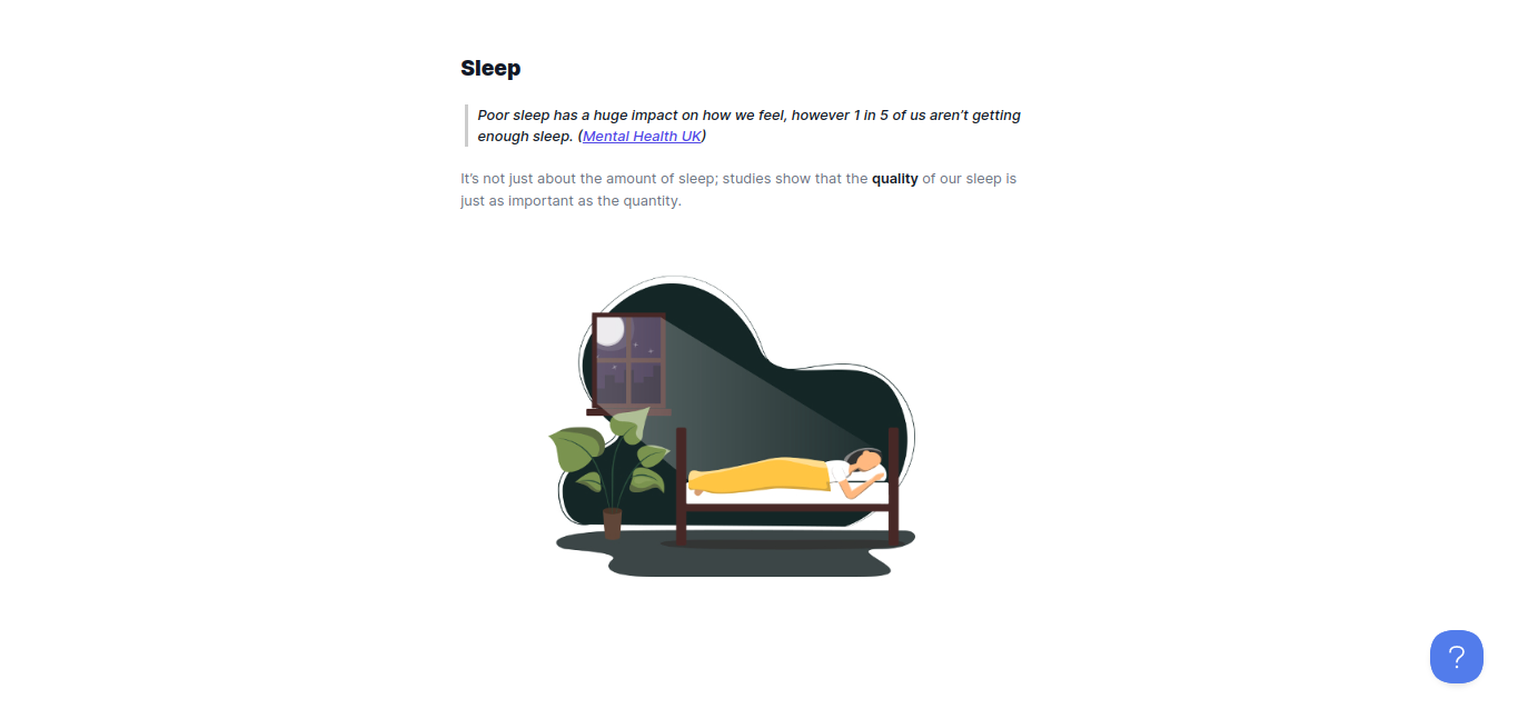 What improvements can be made to our wellbeing to support overall good mental health, such as sleep, diet, taking breaks and support networks; The mental health continuum; Reflecting on your mental health