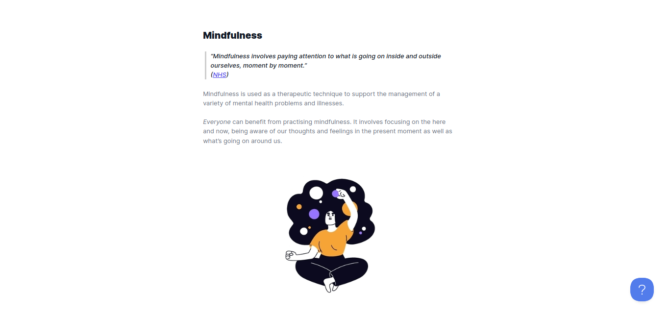 | Supporting Yourself and Others | How to recognise signs that someone is struggling; Offering support; Initiating conversations about mental health; Discussing your mental health with your employer; Working from home; Certain treatments, including mindfulness, medication and therapy; Mental health emergencies. |