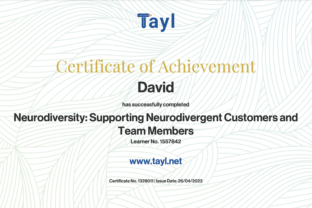 Our Neurodiversity: Supporting Neurodivergent Customers and Team Members course e-learning course is delivered online through our Tayl platform. This means you can complete this course on any device that can access the internet, and you can take a break at any time and save your progress. You can also add more users to your account, access more compliance training courses, and track who has done what.