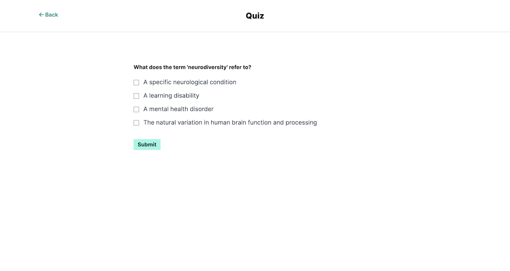 | Understanding Neurodiversity | What is Neurodiversity?; Neurodivergent Conditions; The Importance of Supporting Neurodivergent Customers and Colleagues; Quiz |