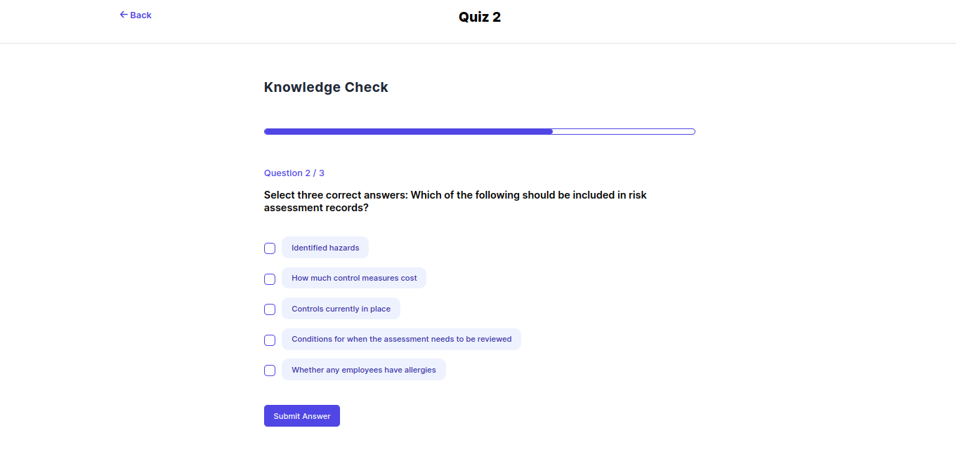 Our Risk Assessments e-learning course is delivered online through our Tayl platform. This means you can complete this course on any device that can access the internet, and you can take a break at any time and save your progress. You can also add more users to your account, access more compliance training courses, and track who has done what.