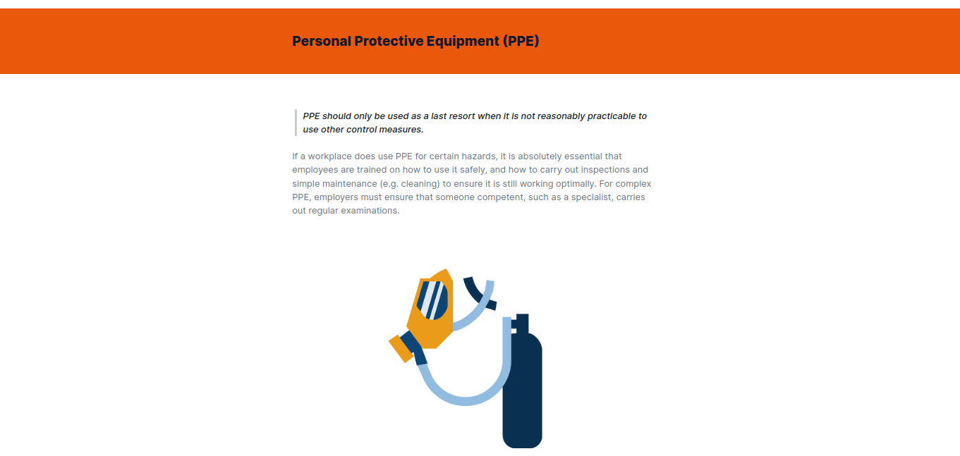 | Control Measures | The hierarchy of control, including elimination, substitution, engineering controls, administrative controls and PPE. |