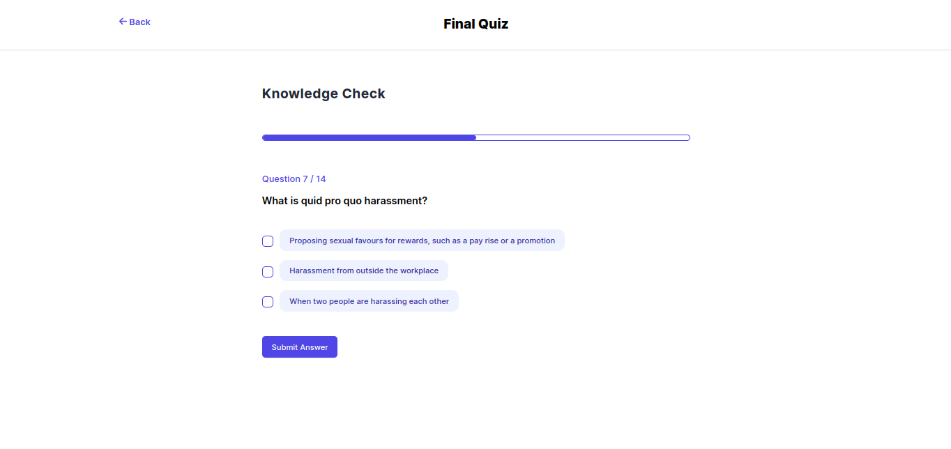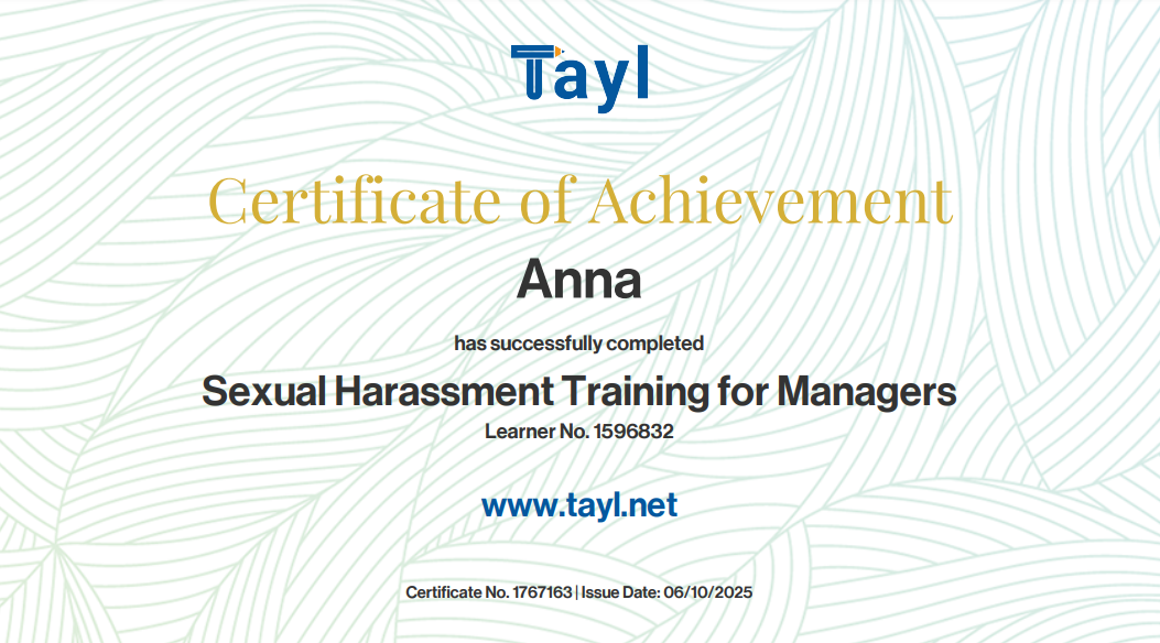 Our Sexual Harassment Training for Managers e-learning course is delivered online through our Tayl platform. This means you can complete this course on any device that can access the internet, and you can take a break at any time and save your progress. You can also add more users to your account, access more compliance training courses, and track who has done what.