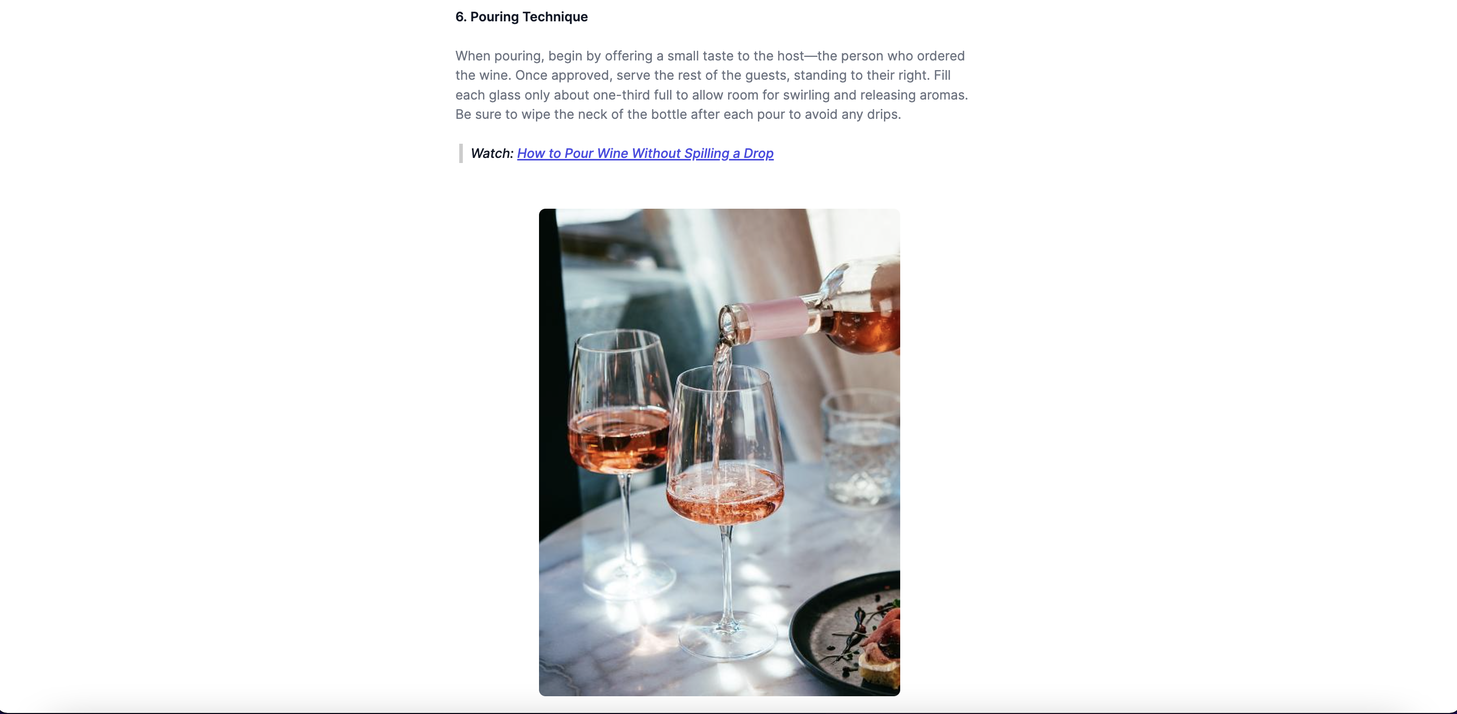 | Wine Basics: Pouring the Perfect Glass of Wine | An introduction to wine; Colours of wine and how wine is made; Types of white, red, rosé and sparkling wine; How to store different types of wine; How to serve wine professionally; The 5 S's of wine tasting. |